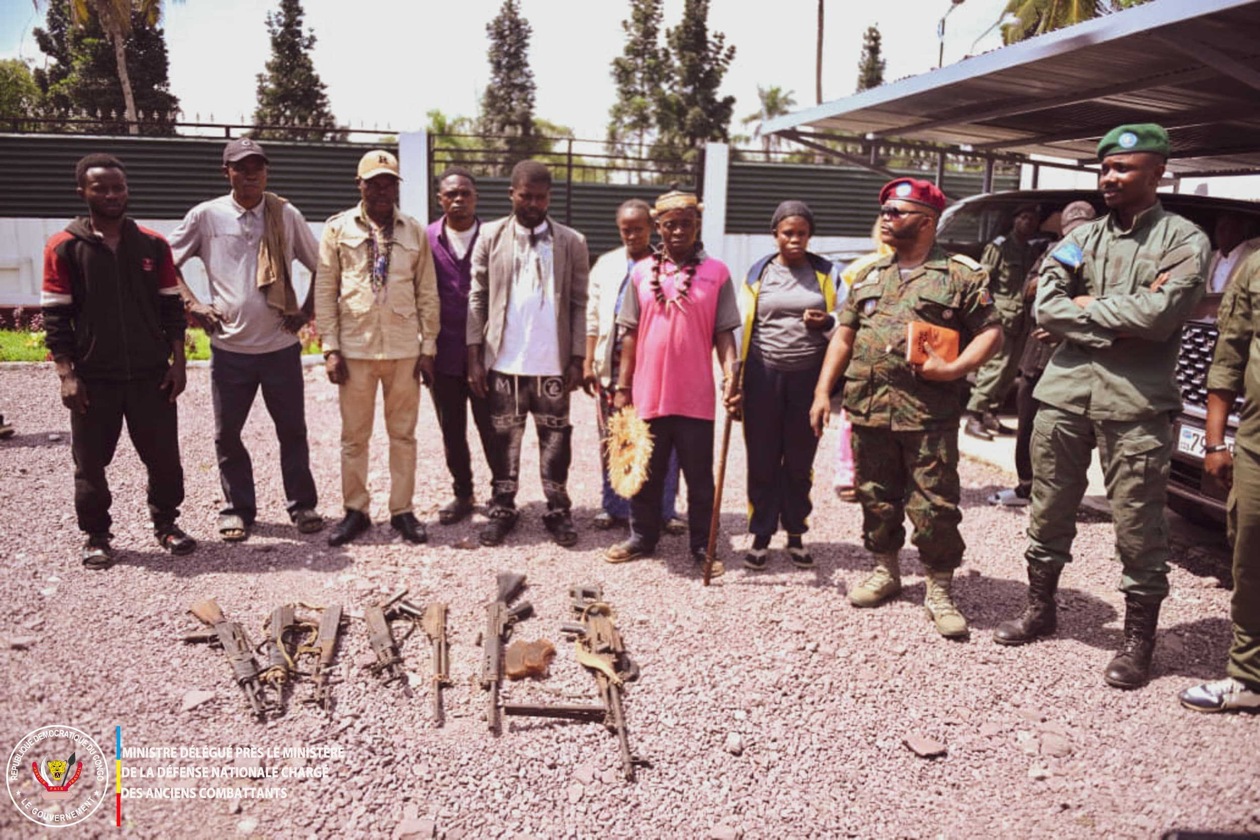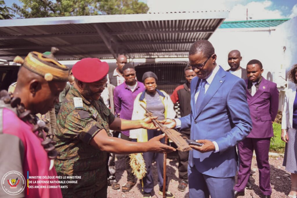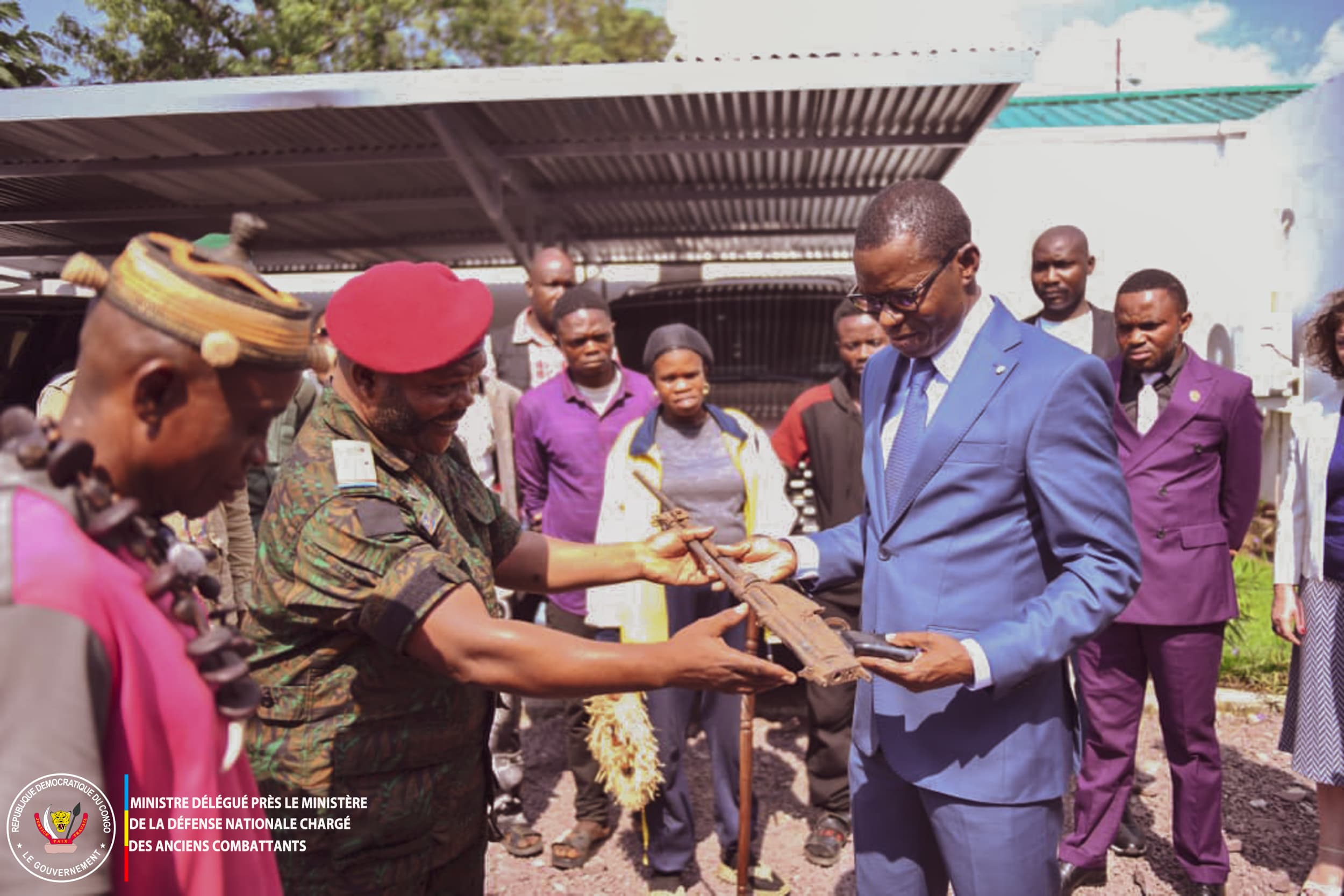Kinshasa, le 16 avril 2025. Après près deux semaines d’intense sensibilisation effectuées dans la province de Maï-Ndombe, la sixième mission, dépêchée dans ce coin de la République, a officiellement remis son rapport ce jeudi 16 avril au Ministre délégué Eliezer Ntambwe Mposhi dans son cabinet de travail. Dans leur exposé de motif, la délégation a remis au Ministre délégué six fusils d’assaut de type AK 47, une mitrailleuse PKM ainsi que deux chargeurs vides.