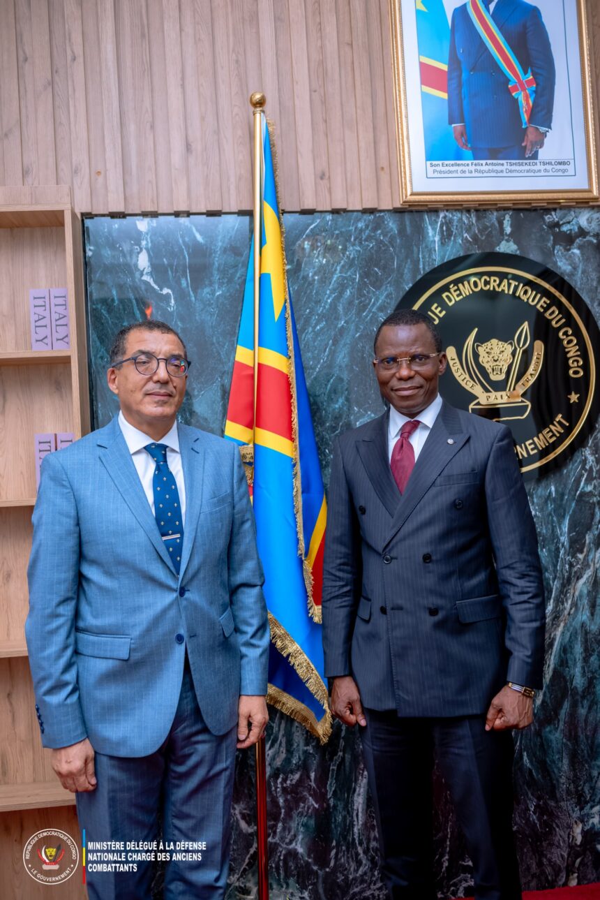 Kinshasa, le 27 novembre 2025. La République démocratique du Congo sera bientôt dotée d’une loi portant statut des anciens combattants. Pour enrichir davantage le travail en cours, le Ministre délégué à la défense nationale Eliezer Ntambwe, initiateur dudit projet de loi, a sollicité l’expertise du Maroc par le biais de son ambassadeur en poste à Kinshasa. Le diplomate marocain Rachid Agassim a rassuré le Ministre délégué Eliezer Ntambwe de la disponibilité de son pays.